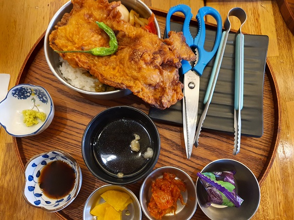 돼지고기로 만든 돈까스 느낌이었지만, 맛은 조금 달랐고, 돈까스 소스가 아니라 간장과 와사비로 먹는 데 특이하고 맛이 있었으며, 곁들인 고명과 양파, 생강 등이 의외로 잘 어울렸습니다.