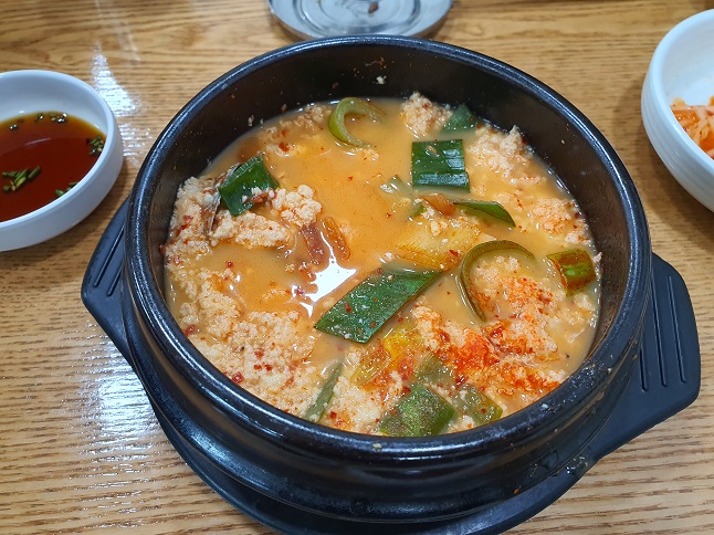 순두부 찌개는 이름과 달리 매운편은 아니었고, 오히려 담백한 베이스에 살짝 매콤한 맛을 한 스푼 첨가한 그런 맛이었습니다. 순두부가 매우 담백하고 고소하여 순두부찌개의 퀄리티는 매우 높은 편이었습니다.