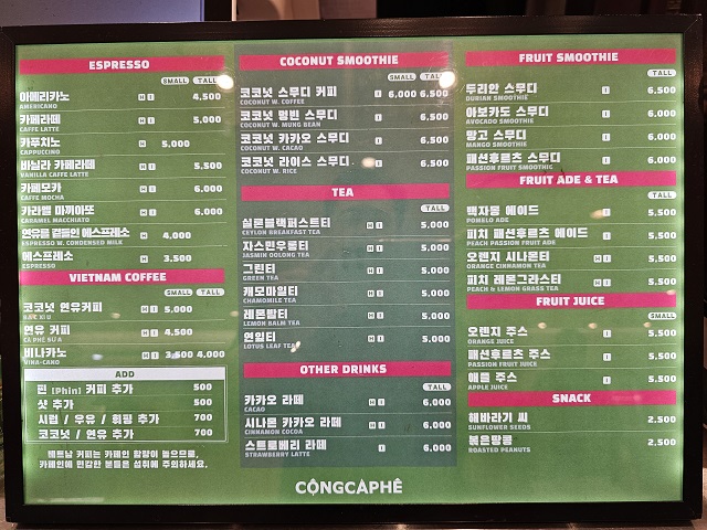 인기메뉴인 코코넛 연유커피는 5,000원, 코코넛 스무디커피는 6,500원 수준입니다.