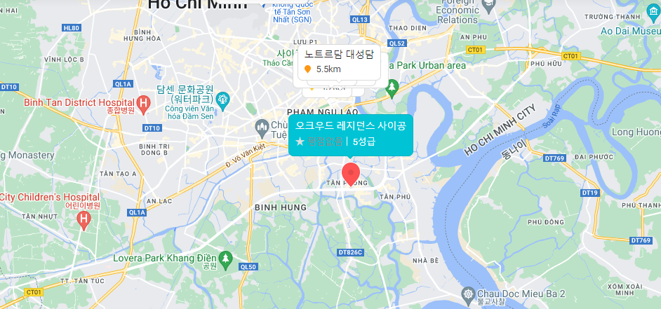 오크우드 레지던스 사이공은 호치민 7군 푸미흥에 위치하고 있고, 호치민 턴선넷 공항에서 40분 정도 떨어진 곳에 위치해 있습니다. (공항에서 막히지 않을 때 기준 40분)