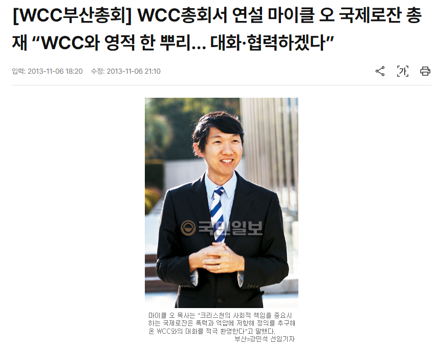 심지어 로잔대회 총재인 '마이클 오'는 한국 부산에서 2013년도에 열렸던 WCC 대회에서 로잔대회와 WCC가 영적으로 한 뿌리이고, 협력하겠다고 공식 표명하기도 하였습니다. 또한 로잔대회의 참가자들의 40%가 WCC 참가자들과 일치합니다.