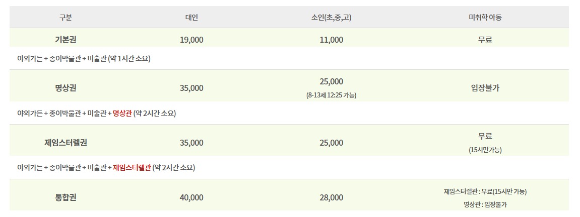 입장권은 학생, 미취학아동, 국가유공자 등에 대해서는 할인을 해주는데, 대부분의 경우 해당사항이 없을 것 같습니다.