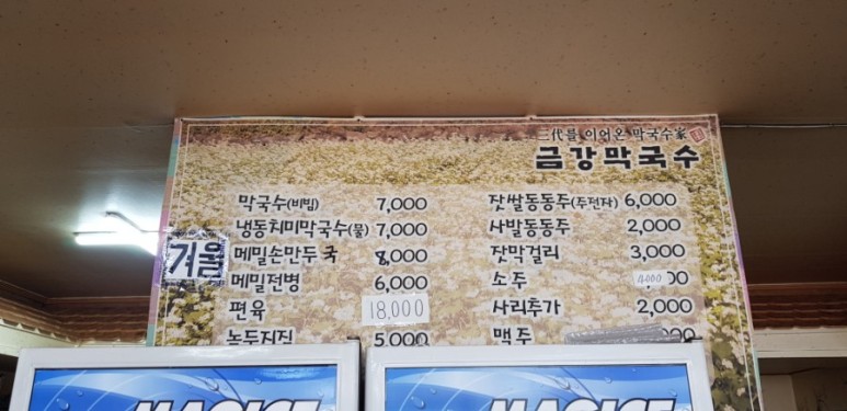 막국수 맛집으로 소문한 음식점 중에 "금강막국수"집이 있습니다. 저는 개인적으로 금강막국수가 전국적인 체인이라고 오인하여서, 춘천 근방을 여행하던 중에 춘천 인근에 있던 금강막국수집을 찾아와 기대하는 마음으로 들어갔습니다.
