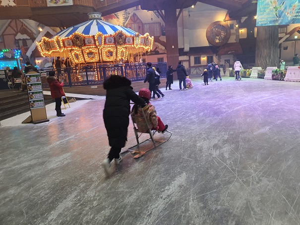 많은 부모들이 아이를 앉히고 썰매를 탔고, 저도 한 번 해 봤는데, 생각보다 쉽지는 않았고, 빙질도 그다지 좋지 않았으며, 썰매도 자주 빙그르르 도는 등 상태가 아주 좋아보이지는 않았습니다. 다양한 썰매를 테스트 해 본 결과, 일부는 상태가 좋았는데, 일부 썰매는 한 방향으로 나가지 못하는 등 문제가 있어 보였습니다.